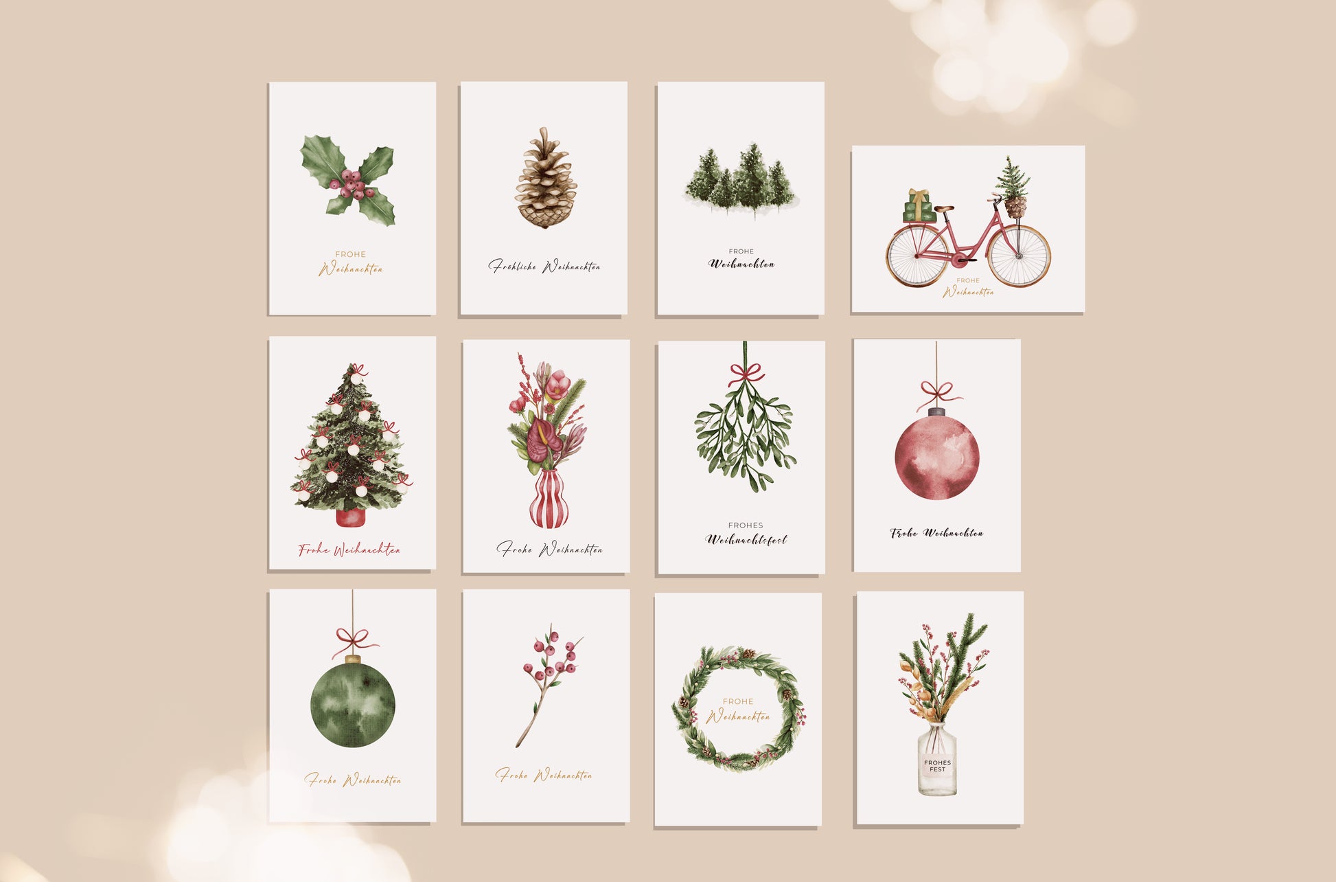 Mit dem 20-er Weihnachtskarten Set bist du perfekt für die Weihnachtszeit ausgestattet. Die weihnachtlichen Aquarellmotive wurden mit viel Liebe fürs Detail im Berliner Studio gefertigt. Das Weihnachtskarten Set erhältst du als Post- oder Klappkarten in DIN A6 Größe auf umweltfreundlichem 300g GMUND Used Papier. Die Rückseite ist blanko unbedruckt – lediglich ein feines Logo ziert den unteren Rand.