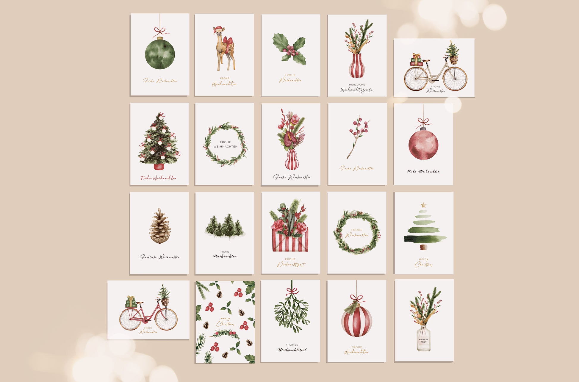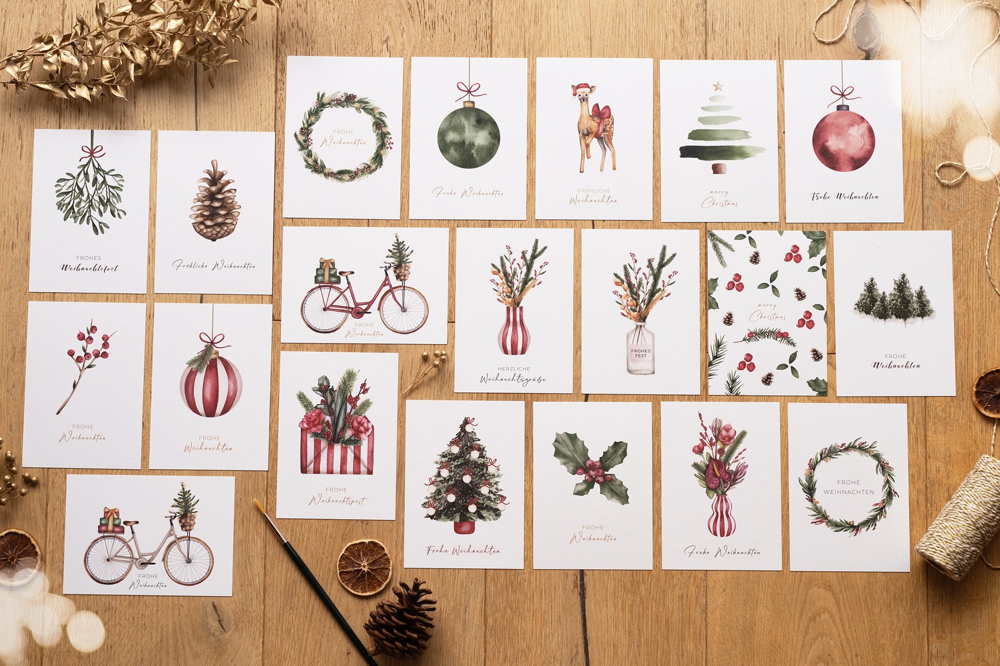Mit dem 20-er Weihnachtskarten Set bist du perfekt für die Weihnachtszeit ausgestattet. Die weihnachtlichen Aquarellmotive wurden mit viel Liebe fürs Detail im Berliner Studio gefertigt. Das Weihnachtskarten Set erhältst du als Post- oder Klappkarten in DIN A6 Größe auf umweltfreundlichem 300g GMUND Used Papier. Die Rückseite ist blanko unbedruckt – lediglich ein feines Logo ziert den unteren Rand.