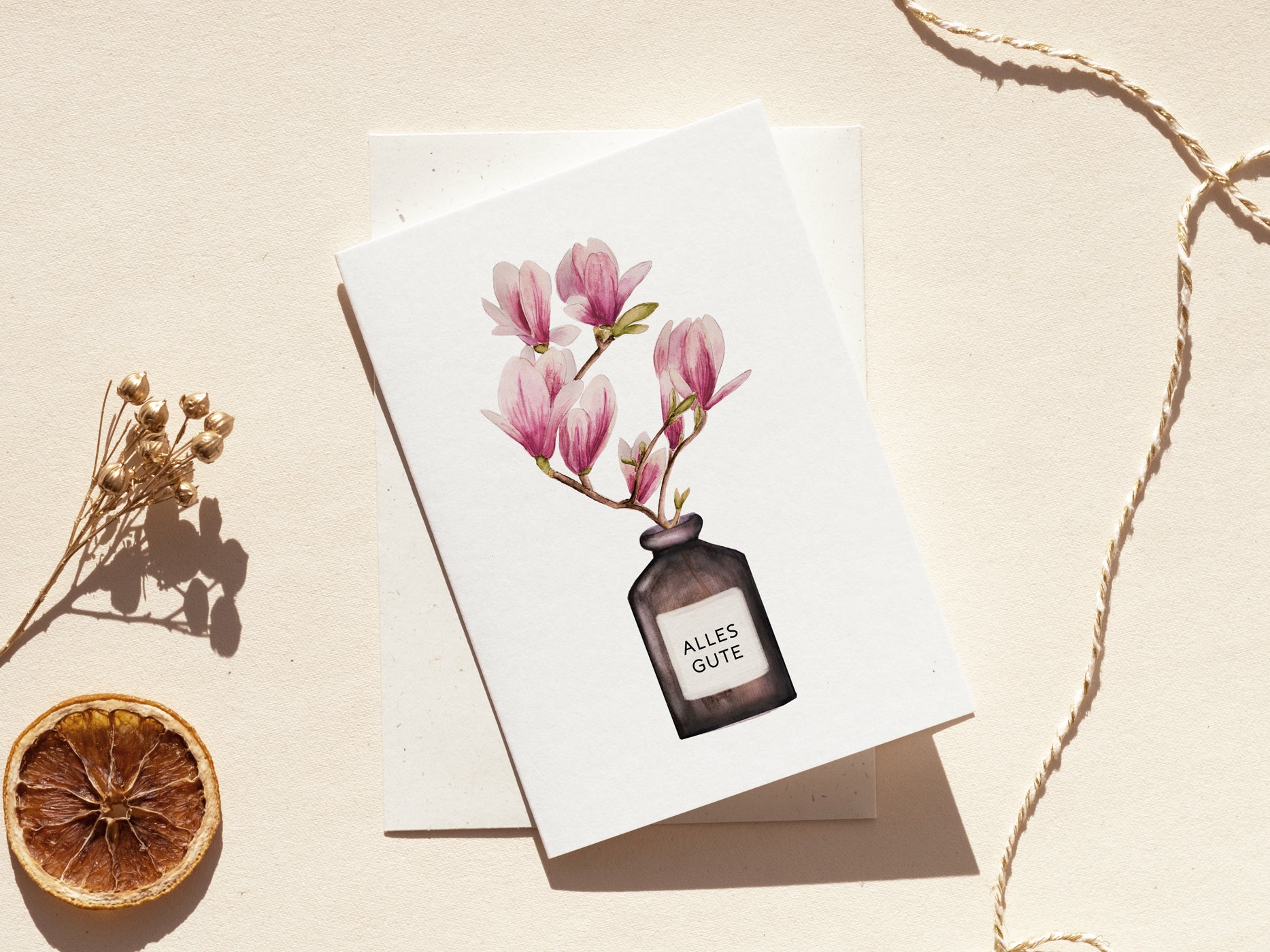 Deine Karte erhältst du mit Kuvert aus hochwertigem Graspapier – mit sichtbaren Naturfasern und einem natürlichen Beigeton, der die feine Ästhetik der Illustration unterstreicht.
