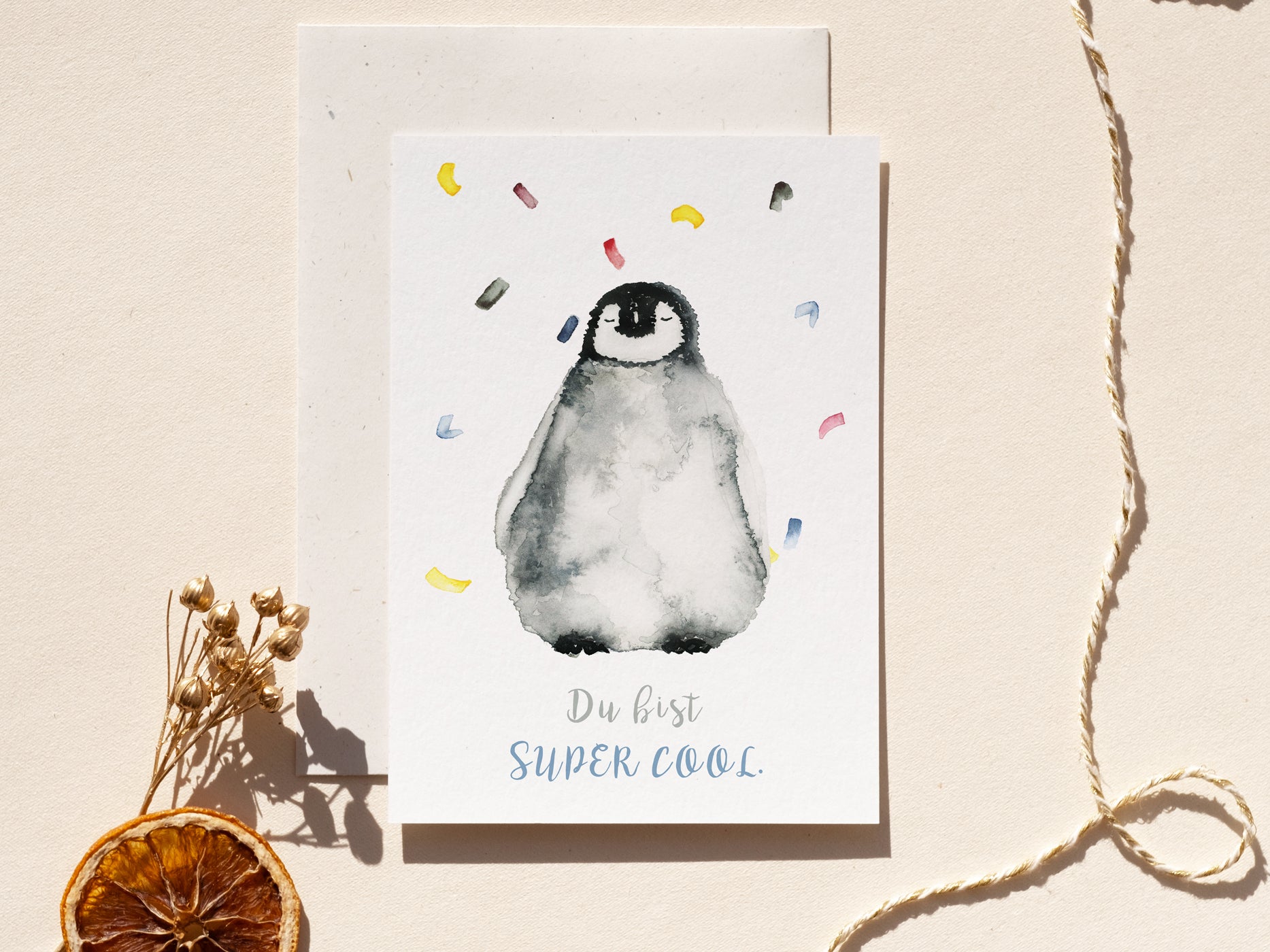Dieser kleine Pinguin bringt Freude und Selbstvertrauen: Mit der Aufschrift „Du bist supercool“ ist die Karte ein liebevoller Mutmacher für Freunde, Familie oder Kollegen.